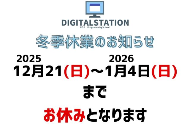 新着情報, ブログ, プログラミング, 学習内容, その他, 子育て, 教育 │ 教室,お休み,お知らせ,教室〈お休み〉のお知らせ 📢 冬季休業のお知らせ 平素より、デジタルステーション習志