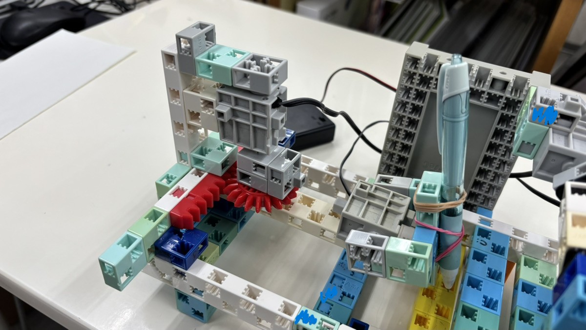 ペンを下ろすためのモーターと、赤い歯車が特徴的な左右移動用のモーター。この2つが組み合わさって、自由に線を描くことができるようになっています!