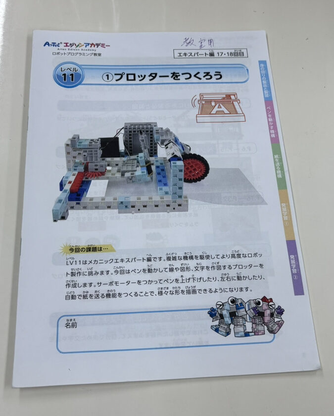 実際に我々の教室のロボットプログラミングコースで取り扱っているこの「①プロッターをつくろう」という教材を使って製作いたしました。ArTecエジソンアカデミー様ありがとうございます。