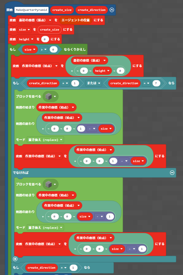 先ほど作った「MakeQuarterPyramid」関数を、方向を変えて4回実行するだけです。