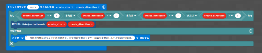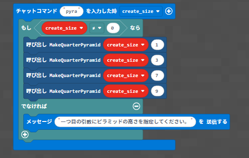チャットコマンドにも引数を作って、そのままさっきの「MakeQuarterPyramid」関数に入れています。