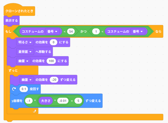 トランプのコスチュームであるコスチューム番号2からコスチューム番号53まででクローンされたとき、すなわちトランプがクローンされたとき、最後面へ移動、幽霊の効果は100にして透明にし、落ちていきながら幽霊の効果を下げて表示させます。また、下がりながら少しづつ回転もさせます。これで、表示させて落ちていくまでの動きはできました。しかし、大きさごとに落ちるスピードを変える、ということができていません。いったい、どうやって実装すればよいのでしょうか?