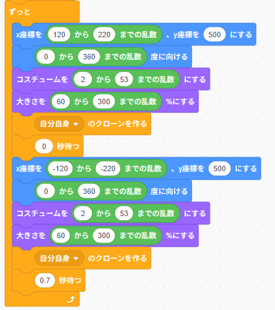こうすることで、タイトル画面の両脇(左:x-120~x-220、右:x120~220)に大きさコスチュームそれぞれのトランプのクローンを作り、繰り返し降らすことができます。