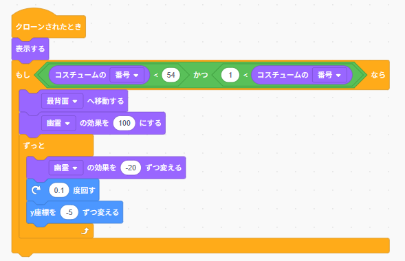 トランプのコスチュームであるコスチューム番号2からコスチューム番号53まででクローンされたとき、すなわちトランプがクローンされたとき、最後面へ移動、幽霊の効果は100にして透明にし、落ちていきながら幽霊の効果を下げて表示させます。また、下がりながら少しづつ回転もさせます。これで、表示させて落ちていくまでの動きはできました。しかし、大きさごとに落ちるスピードを変える、ということができていません。いったい、どうやって実装すればよいのでしょうか?