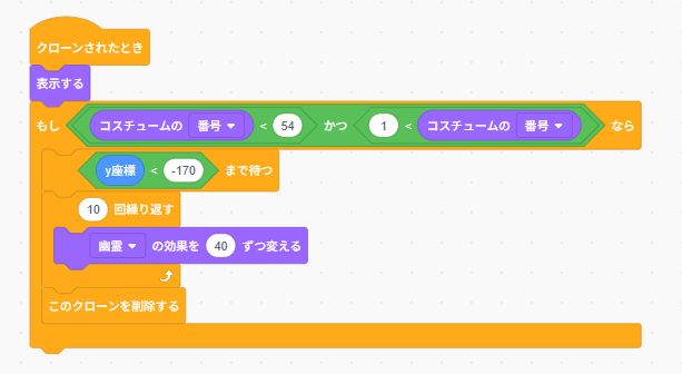 最後に、トランプが下まで落ち切ったときに消すプログラムを組んでいきます。トランプが下に到達しきるときのy座標は-170なので、そこに到達したら幽霊の効果を上げていってトランプを消すようにしていきます。